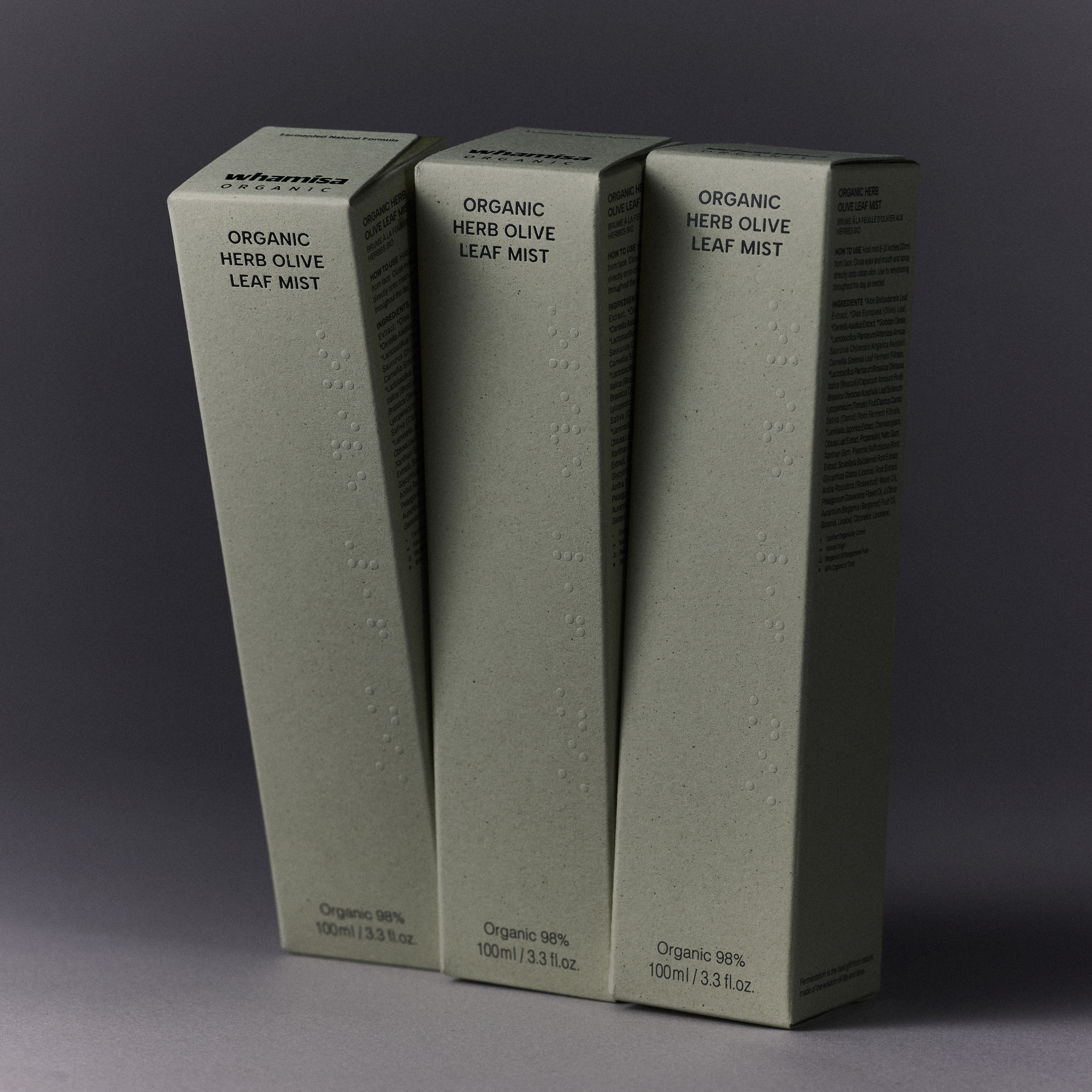 *알로에베라잎추출물, *올리브나무잎, *병풀추출물, **솔비탄올리에이트, *락토바실러스플란타룸/쑥/삼백초/신선초/녹차발효여과물, *락토바실러스플란타룸/브로콜리/파프리카/케일/토마토/당근발효여과물, *다시마추출물, 편백잎추출물, 프로판다이올, 낫토검, 잔탄검, 모란뿌리추출물, 황금추출물, 스페인감초뿌리추출물, 로즈우드오일, 센티드제라늄꽃오일, ▲베르가모트오일, 제라니올, 리날룰, 시트로넬올, 리모넨. (*유기농 **자연유래 ▲베르가모트오일 무광독성) / 유기농 원료 97% / 허브발효 1,000ppm / 올리브나무잎 25,000ppm